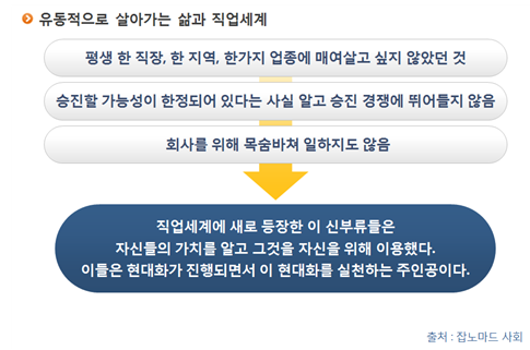 잡노마드 사회 저서에서는 유동성이 강한 유목민의 삶을 현대 신 노동계층의 삶으로 회자하면서 그들의 속성을 이렇게 얘기하고 있다.