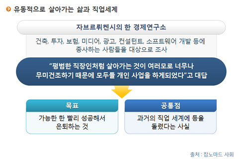 이와 같이 여러 저명한 미래학자들도 향후 미래에는 조직에서 벗어나 자유로운 환경에서 자신의 역량을 극대화시키고 원하는 프로젝트에 따라 전문가들이 모였다 흩어질 수 있는 형태의 일하는 모습을 예견하였다. 점점 더 그러한 신부류의 사고를 가진 프리에이젼트, 잡노마드와 같은 이들의 존재가 더욱 많아질 것이고 자연스러운 근무환경을 가진 하나의 능력있는 1인 기업이 대세가 될 것으로 보인다.